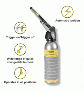 | • Duurzame metalen branderkop • Nieuwe ontworpen regelsysteem • Ruime keus aan branders • Snel en gemakkelijk wisselen van de branders • Automatische werkende (piëzo) ontsteking • Nauwkeurige vlamregeling • Knop met aan/uit en blokkeer functie | • Nieuw uniek gasmengsel (2400 °C) • Lichtgewicht aluminium gaspatroon • Milieuvriendelijk gas • Niet giftig en zonder gevaarlijke stoffen • Bevat 750ml / 450g gas • Automatisch sluitende schroefkoppeling |